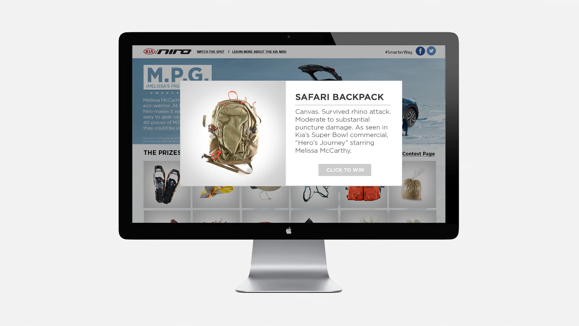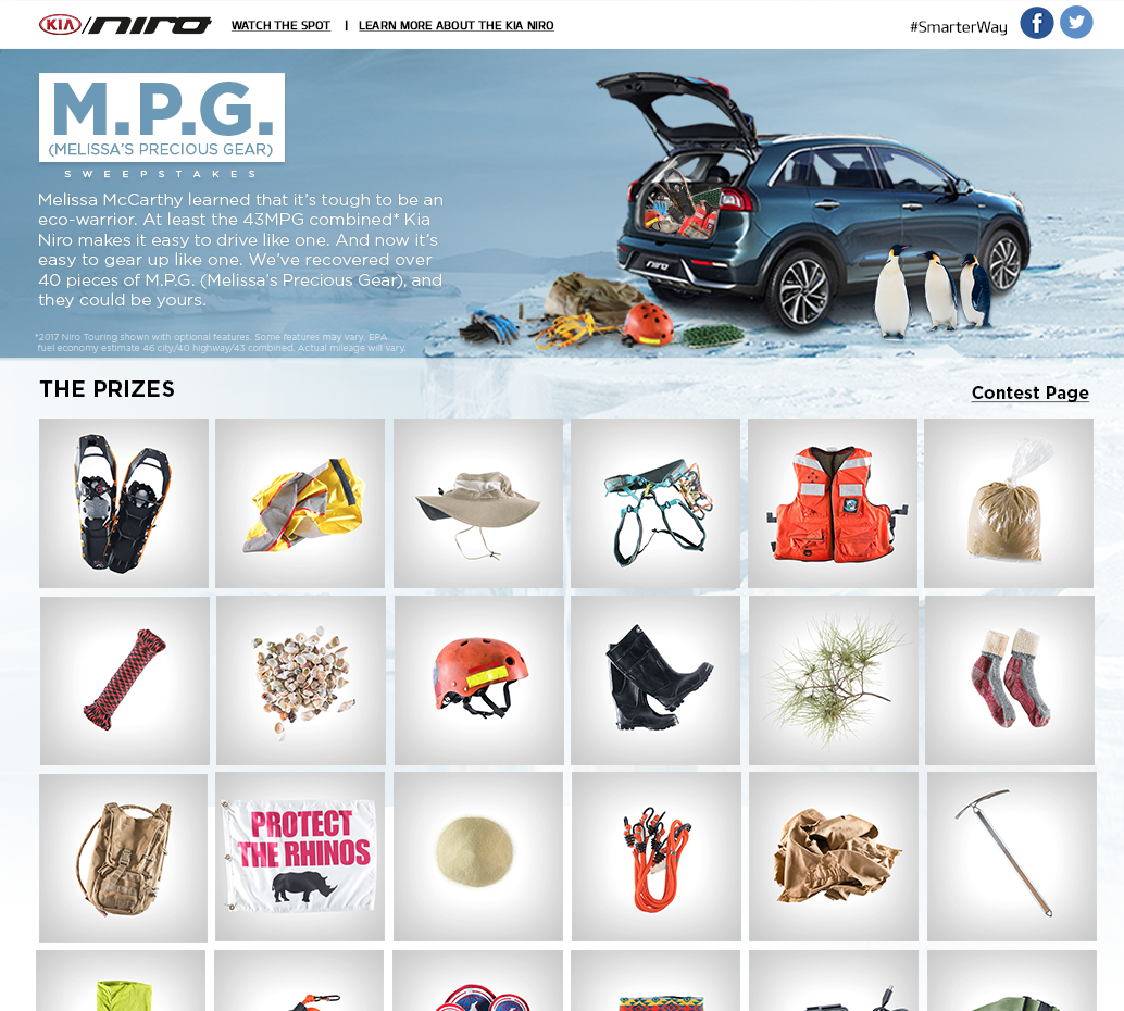 Once the game went live, we invited fans to become part of the story by claiming actual props from Melissa's journey. Ranging from the awesome (snow shoes, Camelbak packs) to the absurd (pine cone, piece of glacier — melted). All playing up the Niro’s impressive MPG.